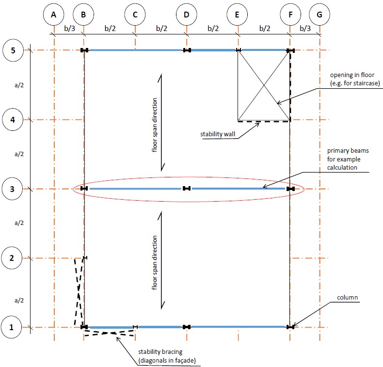For the office that serves as our example building, we want to dimension and check the first-floor beam(s) on axis 3 on the schematic load-bearing construction floor plan in the figure below.