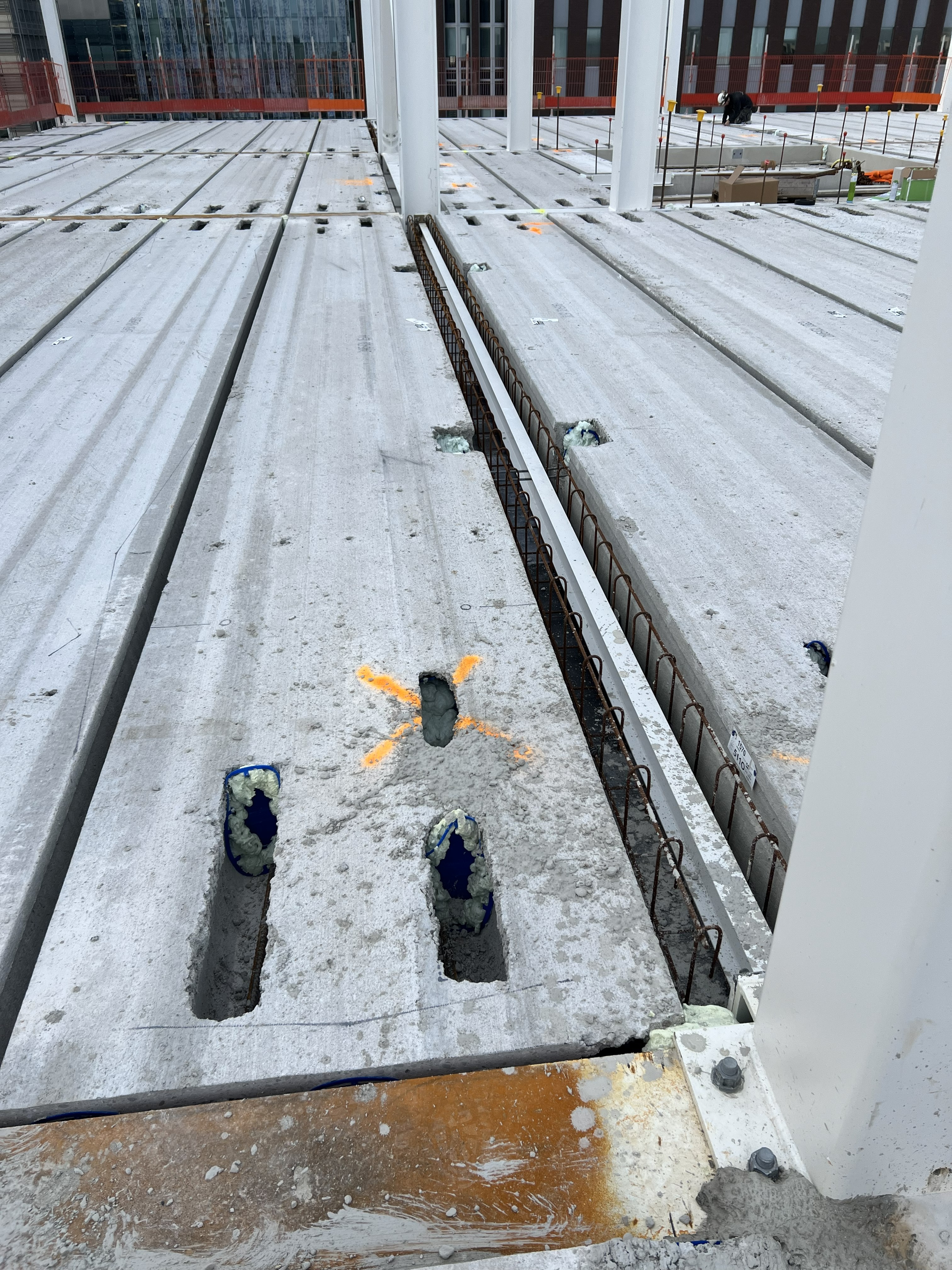 Fig. 10.31 Overview photo of floor field with hollow core slabs: mind the double openings for connections at the ends of each slab and the reinforced strip to transfer wind loads#