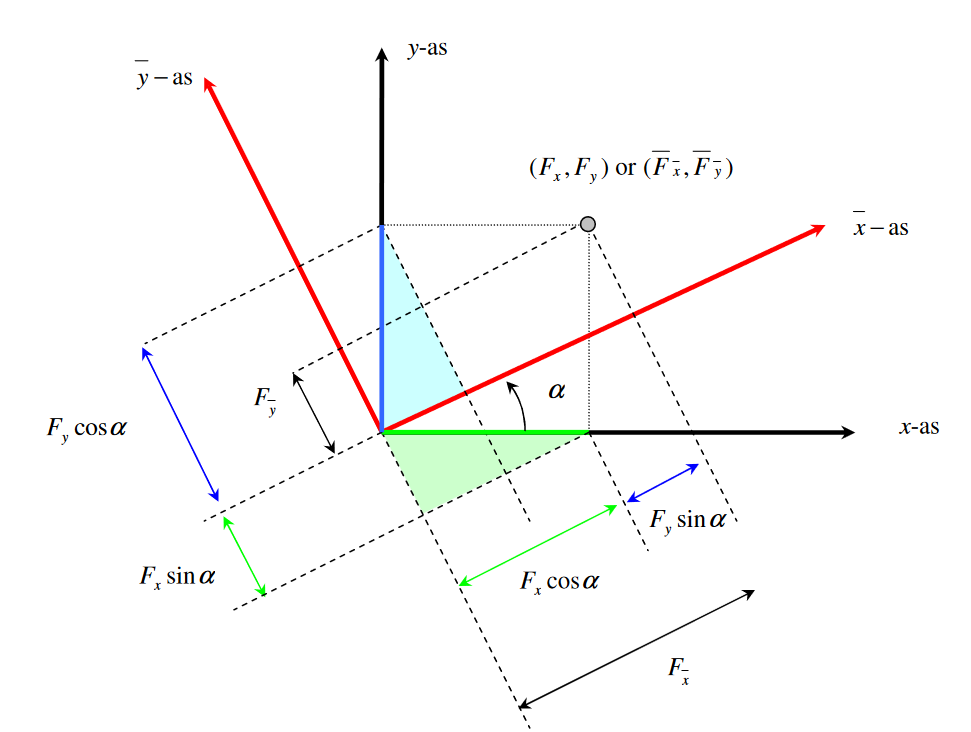 Rotating a first-order tensor (for example force \(F\)) by an angle \(\alpha\) is defined as: