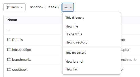 Add filein the top bar. You can either create an entirely new file by clickingCreate new Fileor if you already have created a file you can upload it by clickingUpload files.