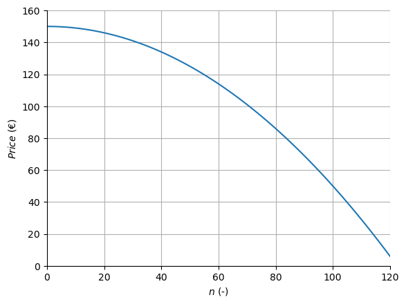 The demand depends on the price (\(Price = 150 - 0.01n^2\)), as shown in the graph:
