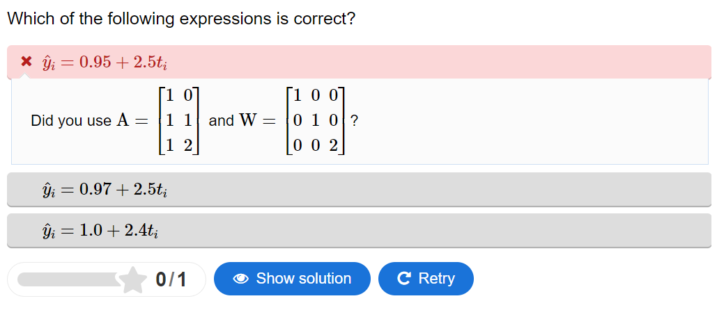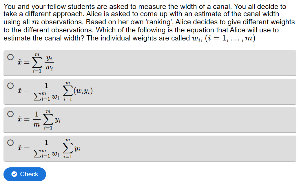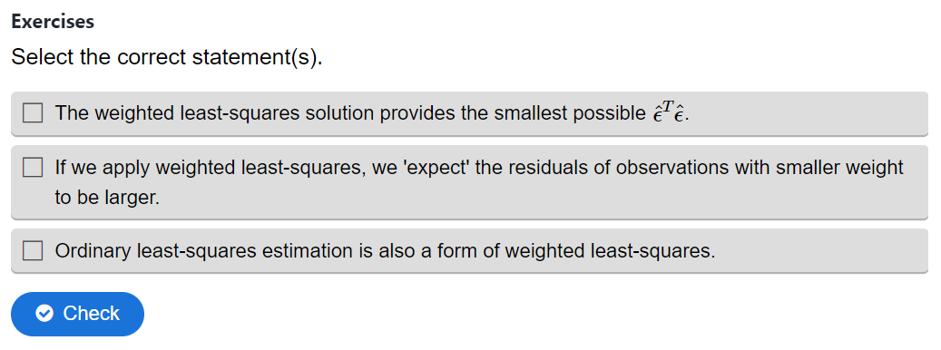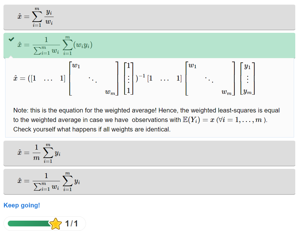 The following question sets are taken from chapter 3.3. Weighted least-squares estimation of the MUDE 23/24 book. The chapter builds on the previous chapter on simple least-squares estimation and dwelves into the importance and properties of the weight matrix. The student is primarily quizzed using multiple choice questions to check their understanding. The answers can be provided in the shape of text, figures, equations, matrices and probably much more.