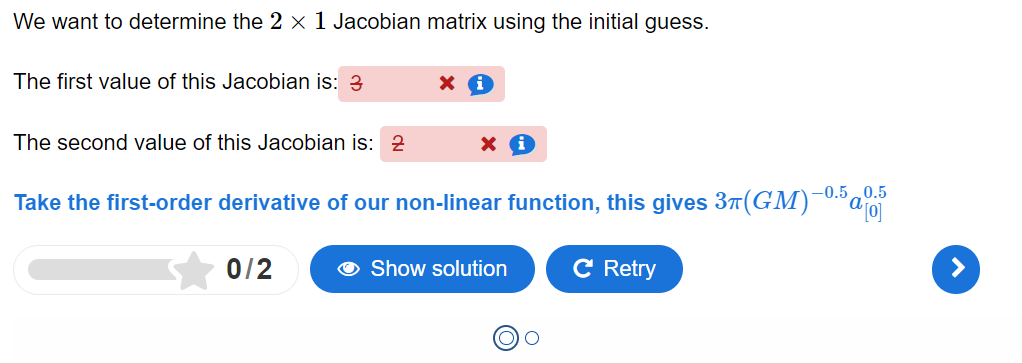 Chapter 3.7. Non-linear least-squares estimation from the MUDE 23/24 book makes use of the complex fill in the blanks quiz in order to check that the students understood the composition of the Jacobian Matrix specifically used in deriving the linearized functional model. This model is essential for accurately estimating values and assessing system behavior of complex processes that arent linear.