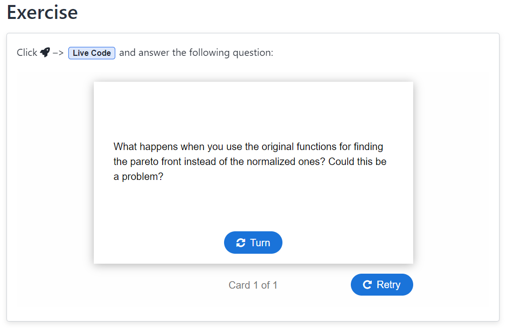 The H5p quizzes can shine in the section on questions, discussions and comments. Next to many multiple choice questions (which are discussed later) there are dialog cards which can ask more conceptual and open ended questions. Pressing on the blue button Turn will flip around the card and reveal the model answer. The great thing about the integration of both interactive aspects (coding and questions) helps the student to play around with the code and understand the topic from a less theoretical point-of-view.