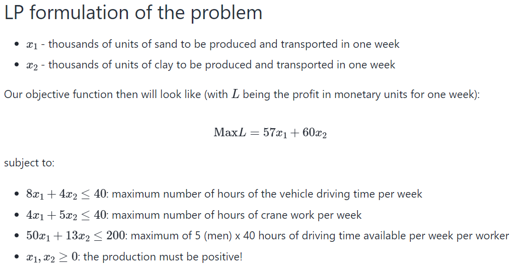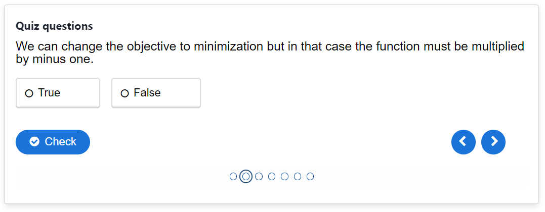 Since the cells can be used to evaluate numerical answers, they are an easy way to quiz the student on matrices and evaluate the result of each position indidependently. The optimization team of MUDE took this a step further and used this set-up to quiz the students on the SIMPLEX method. This method automates the solving of the augmented form of a linear programing problem with continuous variables. It makes use of tables and the manipulation of equations to find the optimal vaues. Unfortunately, with a large number of variables this tables tend to get quite big and filling in the cells becomes laborous.