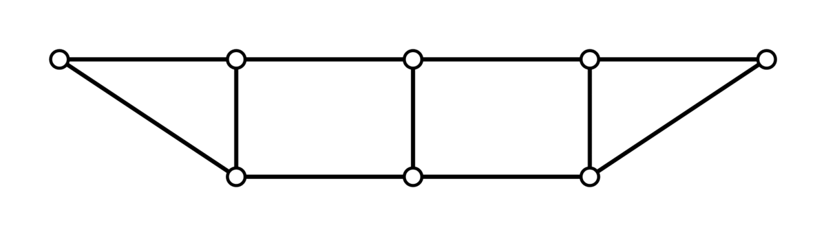 Truss structures are modelled as rigid bars (so elements which cannot deform) connected by hinges (so elements can rotate with respect to one each other). In our model, hinges are indicate with a circle, and bars with a line. For example, the structure you’ve seen in the second example (with two diagonal bars removed) is modelled as follows: