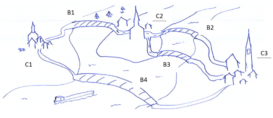 A pre-fabricated bridge design is being considered for river crossings in a remote region of the world, as shown in Figure 1. Cities 1, 2 and 3 are labelled C1, C2 and C3, with bridges labelled B1-B4.
